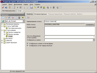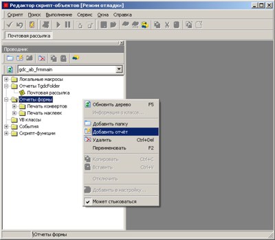 - В редакторе скрипт-объектов на панели «Проводник» найдем пункт «Отчеты формы» и щелкнем по нему правой кнопкой мыши. В появившемся меню выберем команду «Добавить отчет».