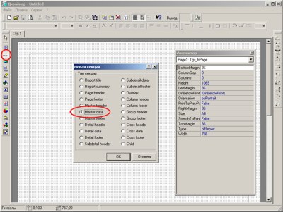 - На экране откроется окно редактора печатной формы. На панели инструментов найдем команду «Вставить секцию» и выберем ее. Поместим секцию на лист. В появившемся окне выберем тип секции — «Master Data».
